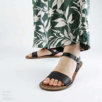 Vegane Grand Step Shoes Barfußsandalen Sandalen Vegan Fair hergestellt Hergestellt in Spanien Mit Palmblättern und Mais Modische, super leichte und flexible Barfuß-Sandalen aus mit Obermaterial auf Basis von Mais. Das bequeme Fußbett ist bezogen mit einem Material aus bedruckten Palmblättern. Die weiche Sohle aus Gummi ist sehr flexibel und passt sich jeder Bewegung an.   Vorteile von Barfußschuhen: Zero Drop: Fördert eine natürliche Haltung und Bewegung. Breiter Leisten: Mehr Platz für die Zehen und bessere Fußstellung. Flexible Sohle: Unterstützt Bewegungsfreiheit und natürliche Wahrnehmung. Hergestellt in Spanien Spanien ist bekannt für eine qualitativ hochwertige Schuhproduktion. Die spanischen Schuhfabriken haben große Erfahrung mit der Herstellung von Schuhen. Die spanischen Schuhproduzent*innen legen viel Wert auf Nachhaltigkeit. Viele Fabriken verwenden umweltfreundliche Materialien und Produktionsmethoden und minimieren so die Umweltbelastung. Dies ist nicht nur gut für die Umwelt, sondern auch für die Menschen, da diese so nicht mit schädlichen Stoffen in Kontakt kommen . Auch die faire Bezahlung der Arbeiter*innen und die Arbeitsbedingungen werden hier großgeschrieben. Wer also auf der Suche nach qualitativ hochwertigen und nachhaltigen Schuhen ist, sollte sich Schuhe aus Spanien genauer anschauen. Grand Step Shoes Grand Step Shoes ist eine deutsche Schuhmarke, die für ihre hochwertigen und nachhaltigen Schuhe bekannt ist. Die Marke setzt auf innovative Materialien wie Apple Skin und natürliche Stoffe wie Baumwolle und Gummi, sowie recycelte Kunststoffe. Verwendet werden ausschließlich umweltfreundliche Materialien und Produktionsmethoden. Dabei legt Grand Step Shoes besonderen Wert auf eine faire Arbeitsbedingungen und die Einhaltung sozialer Standards. Mit ihrem modernen und dennoch zeitlosen Design sprechen die Schuhe von Grand Step Shoes eine breite Zielgruppe an und bieten eine nachhaltige Alternative für Modebewusste, die auf Qualität achten und umweltbewusst sind.