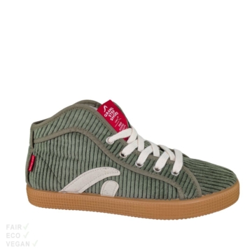 Taylor Cord Sneaker Vegan Fair hergestellt Hergestellt in Spanien Mit Bio-Baumwolle und Gummi Die olivgrüne veganen High Top Sneaker von Grand Step Shoes haben ein Obermaterial aus breit geripptem Cordstoff . Die 5 Loch Schuhe sind frei von tierischen Produkten und bieten durch die soften Sohlen einen hohen Tragekomfort. Die knöchelhohe Form und das auffällige Corddesign verleihen jedem Outfit das gewisse Extra. Obermaterial: Polyester. Innenmaterial: Bio-Baumwolle. Die Innensohlen sind aus einem Schaum auf Zuckerrohrbasis und mit Baumwolle beschichtet. Sohlen: Laufsohlen aus Gummi. Schaft/Absatz/Extras: Flache durchgehende Sohlen. Schafthöhe bei Größe 40 ca. 10,5cm. Die Innensohlen sind fest eingeklebt. Die Schnürsenkel sind aus recycelter Baumwolle und die Aufgenähten Etiketten aus recyceltem Polyester. Schuhpflege: Leicht zu pflegen. Einfach nur mit einer Bürste reinigen. Bei größeren Verschmutzungen mit einem in lauwarmem Wasser getränktem Lappen reinigen. Fair | Vegan | Ökologisch: Fair: Hergestellt in Spanien. Vegan: Alle verwendeten Materialien sind ohne tierische Inhaltsstoffe. Ökologisch: Aus Bio-Baumwolle und Gummi. Die Schuhkartons haben kurze Transportwege innerhalb Europas. Hergestellt in Spanien Spanien ist bekannt für eine qualitativ hochwertige Schuhproduktion. Die spanischen Schuhfabriken haben große Erfahrung mit der Herstellung von Schuhen. Die spanischen Schuhproduzent*innen legen viel Wert auf Nachhaltigkeit. Viele Fabriken verwenden umweltfreundliche Materialien und Produktionsmethoden und minimieren so die Umweltbelastung. Dies ist nicht nur gut für die Umwelt, sondern auch für die Menschen, da diese so nicht mit schädlichen Stoffen in Kontakt kommen . Auch die faire Bezahlung der Arbeiter*innen und die Arbeitsbedingungen werden hier großgeschrieben. Wer also auf der Suche nach qualitativ hochwertigen und nachhaltigen Schuhen ist, sollte sich Schuhe aus Spanien genauer anschauen. Grand Step Shoes Grand Step Shoes ist eine deutsche Schuhmarke, die für ihre hochwertigen und nachhaltigen Schuhe bekannt ist. Die Marke setzt auf innovative Materialien wie Apple Skin und natürliche Stoffe wie Baumwolle und Gummi. Verwendet werden ausschließlich umweltfreundliche Materialien und Produktionsmethoden. Dabei legt Grand Step Shoes besonderen Wert auf eine faire Arbeitsbedingungen und die Einhaltung sozialer Standards. Mit ihrem modernen und dennoch zeitlosen Design sprechen die Schuhe von Grand Step Shoes eine breite Zielgruppe an und bieten eine nachhaltige Alternative für Modebewusste, die auf Qualität achten und umweltbewusst sind.
