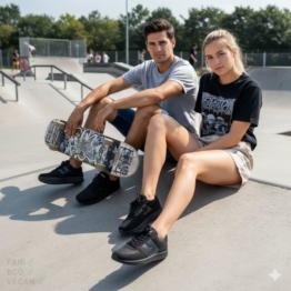 Vegane Sneaker im Retro-Design Schicke Retro Sneaker mit sportlichem Design. Das Obermaterial der 6 Loch Sneaker besteht aus einem matten weichen Lederimitat. Obermaterial: Mikrofasern, teilweise aus recyceltem Polyester. CO2-klimaneutral hergestellt Schadstoffgeprüft und frei von gesundheitsschädlichen Stoffen. Innenmaterial: High Tech Mikrofasern, CO2-klimaneutral hergestellt Kann bis zum 8fachen des eigenen Gewichtes an Wasser aufnehmen Sehr atmungsaktiv | Wärmeregulierend Antibakteriell | Antimikrobiell | Hypoallergen Schadstoffgeprüft und frei von gesundheitsschädlichen Stoffen. Sohlen: Die Sohlen sind aus Gummi. Schaft/Absatz/Extras: Flache durchgehende Sohlen. Pflege: Leicht zu pflegen. Imprägnieren nicht notwendig. Einfach nur reinigen und ggf., zum entfernen von Kratzern und Flecken, ab und zu mit neutraler Schuhcreme behandeln. Die Schuhcreme schützt auch vor der Anhaftung von Schmutz und vermindert die Bildung von Salzrändern. Fair/Vegan/Ökologisch: Fair: Hergestellt in Portugal. Vegan: Alle verwendeten Materialien sind ohne tierische Inhaltsstoffe. Ökologisch: Ohne Leder, daher auch frei von Chrom VI. Teilweise aus recycelten Stoffen. Die Schuhkartons haben kurze Transportwege innerhalb Europas.