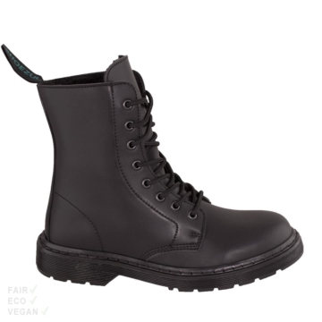Jetzt zum Preis von 139€ statt 159€ vorbestellen. Vegane 8 Loch Zip Stiefel mit  recyceltem PET Winterfutter Vegan Fair hergestellt Lederfrei Aus hochwertigen Mikrofasern Atmungsaktiv & dehnbar Mit Warmfutter aus recyceltem PET Bequeme 8 Loch Schnürboots im bekannten und bewährten UK Design. Mit Warmfutter aus recyceltem PET. Obermaterial: High Tech Mikrofasern, CO2-klimaneutral hergestellt Wasserabweisend und wasserbeständig Atmungsaktiv Sehr widerstandsfähig Schadstoffgeprüft und frei von gesundheitsschädlichen Stoffen. Innenmaterial: Gefüttert mit dickem Warmfutter aus recyceltem PET (GRS – Global Recycle Standard zertifiziert.). Innensohlen, ebenfalls mit Warmfutter, herausnehmbar. Sohlen: Die Sohlen sind aus Kunststoff und wiederbesohlbar. Schaft/Absatz/Extras: Schafthöhe bei einer mittleren Größe ca. 17cm. Absatzhöhe hinten ca. 2,7cm. Die Innensohlen sind herausnehmbar. Pflege: Leicht zu pflegen. Imprägnieren nicht notwendig. Einfach nur reinigen und ggf., zum entfernen von Kratzern und Flecken, ab und zu mit Schuhcreme wie Black Polish behandeln. Die Schuhcreme schützt auch vor der Anhaftung von Schmutz und vermindert die Bildung von Salzrändern. Bitte Pflegemittel gleich mitbestellen . Fair/Vegan/Ökologisch: Fair: Hergestellt in Portugal. Vegan: Alle verwendeten Materialien sind ohne tierische Inhaltsstoffe. Ökologisch: Ohne Leder, daher auch frei von Chrom VI. Die Schuhkartons haben kurze Transportwege innerhalb Europas. Die lederfreien 8 Loch Unisex Boots gibt es in Damen-, Herren- bzw. Diversgrößen von 36 bis 46.