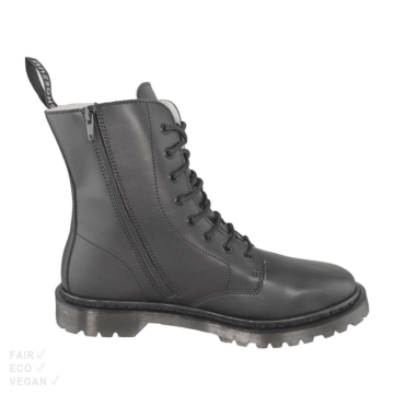 Vegane 8 Loch Stiefel mit Warmfutter Vegan Fair in Portugal hergestellt Lederfrei Mit Warmfutter Recycling-Anteil Super bequeme 8 Loch Schnürboots mit Reißverschlüssen an den Schaftinnenseiten. Bekanntes und bewährten Design, aber mit kuschelig warmem Innenfutter aus recyceltem PET. Obermaterial: High Tech Mikrofasern, CO2-klimaneutral hergestellt Wasserabweisend und wasserbeständig Atmungsaktiv Sehr widerstandsfähig Schadstoffgeprüft und frei von gesundheitsschädlichen Stoffen. Innenmaterial: Gefüttert mit dickem Warmfutter aus recyceltem PET (GRS – Global Recycle Standard zertifiziert.). Innensohlen, ebenfalls mit Warmfutter, herausnehmbar. Sohlen: Die Sohlen sind aus Kunststoff und wiederbesohlbar. Schaft/Absatz/Extras: Schafthöhe bei einer mittleren Größe ca. 17cm. Absatzhöhe hinten ca. 2,7cm. Die Innensohlen sind herausnehmbar. Pflege: Leicht zu pflegen. Imprägnieren nicht notwendig. Einfach nur reinigen und ggf., zum entfernen von Kratzern und Flecken, ab und zu mit Schuhcreme behandeln. Die Schuhcreme schützt auch vor der Anhaftung von Schmutz und vermindert die Bildung von Salzrändern. Bitte Pflegemittel gleich mitbestellen . Fair/Vegan/Ökologisch: Fair: Hergestellt in Portugal. Vegan: Alle verwendeten Materialien sind ohne tierische Inhaltsstoffe. Ökologisch: Ohne Leder, daher auch frei von Chrom VI. Die Schuhkartons haben kurze Transportwege innerhalb Europas. Die lederfreien 8 Loch Unisex Boots gibt es in Damen-, Herren- bzw. Diversgrößen von 37 bis 46.