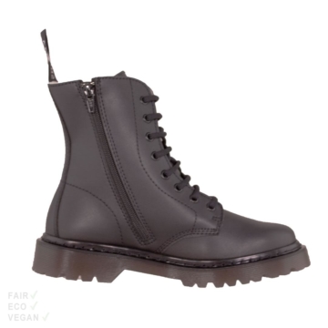 Vegane 8 Loch Stiefel mit Warmfutter Vegan Fair in Portugal hergestellt Lederfrei Mit Warmfutter Recycling-Anteil Größe nicht mehr lieferbar? Weitere Varianten ansehen. Hier geht’s zur Übersicht aller Boots aus der Serie: ►Wintervariante mit Warmfutter ►Ganzjahresvariante mit Mikrofaserfutter ►Alle Infos zur UK Boot Serie Super bequeme 8 Loch Schnürboots mit Reißverschlüssen an den Schaftinnenseiten. Bekanntes und bewährten Design, aber mit kuschelig warmem Innenfutter aus recyceltem PET. Obermaterial: High Tech Mikrofasern, CO2-klimaneutral hergestellt Wasserabweisend und wasserbeständig Atmungsaktiv Sehr widerstandsfähig Schadstoffgeprüft und frei von gesundheitsschädlichen Stoffen. Innenmaterial: Gefüttert mit dickem Warmfutter aus recyceltem PET (GRS – Global Recycle Standard zertifiziert.). Innensohlen, ebenfalls mit Warmfutter, herausnehmbar. Sohlen: Die Sohlen sind aus Kunststoff und wiederbesohlbar. Schaft/Absatz/Extras: Schafthöhe bei einer mittleren Größe ca. 17cm. Absatzhöhe hinten ca. 2,7cm. Die Innensohlen sind herausnehmbar. Pflege: Leicht zu pflegen. Imprägnieren nicht notwendig. Einfach nur reinigen und ggf., zum entfernen von Kratzern und Flecken, ab und zu mit Schuhcreme behandeln. Die Schuhcreme schützt auch vor der Anhaftung von Schmutz und vermindert die Bildung von Salzrändern. Bitte Pflegemittel gleich mitbestellen . Fair/Vegan/Ökologisch: Fair: Hergestellt in Portugal. Vegan: Alle verwendeten Materialien sind ohne tierische Inhaltsstoffe. Ökologisch: Ohne Leder, daher auch frei von Chrom VI. Die Schuhkartons haben kurze Transportwege innerhalb Europas. Die lederfreien 8 Loch Unisex Boots gibt es in Damen-, Herren- bzw. Diversgrößen von 37 bis 46.