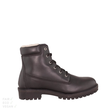 Zeitloses Workboot-Design trifft auf moderne Materialien Robuste 6 Loch Schnürboots in klassischem Design. Die Allrounder aus High Tech Mikrofasern. Obermaterial: High Tech Mikrofasern, CO2-klimaneutral hergestellt Wasserabweisend und wasserbeständig Atmungsaktiv Sehr widerstandsfähig Schadstoffgeprüft und frei von gesundheitsschädlichen Stoffen. Innenmaterial: Gefüttert mit dickem Warmfutter aus recyceltem PET. Innensohlen, ebenfalls mit Warmfutter, herausnehmbar. GRS – Global Recycle Standard zertifiziert. Sohlen: Die Sohlen sind aus Gummi und wiederbesohlbar. Schaft/Absatz/Extras: Schafthöhe bei einer mittleren Größe ca. 14,5cm. Absatzhöhe hinten ca. 2,7cm. Die Innensohlen sind herausnehmbar. Pflege: Leicht zu pflegen. Imprägnieren nicht notwendig. Einfach nur reinigen und ggf., zum entfernen von Kratzern und Flecken, ab und zu mit Schuhcreme wie Black Polish behandeln. Die Schuhcreme schützt auch vor der Anhaftung von Schmutz und vermindert die Bildung von Salzrändern. Bitte Pflegemittel gleich mitbestellen . Fair/Vegan/Ökologisch: Fair: Hergestellt in Portugal. Vegan: Alle verwendeten Materialien sind ohne tierische Inhaltsstoffe. Ökologisch: Ohne Leder, daher auch frei von Chrom VI. Kurze Transportwege. Die lederfreien 6 Loch Unisex Boots gibt es in Damen-, Herren- bzw. Diversgrößen von 36 bis 48.