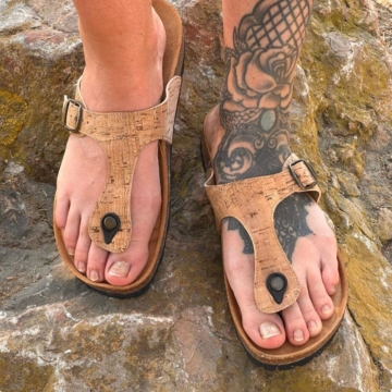Zehentrenner Sandalen aus Kork Toe Post Sandalen in zeitlosem Design, aber mit natürlichem Kork.. Obermaterial: Kork. Innenmaterial: High Tech Mikrofasern, CO2-klimaneutral hergestellt Antibakteriell | Antimikrobiell | Hypoallergen Schadstoffgeprüft und frei von gesundheitsschädlichen Stoffen. Sohlen: Die Sohlen sind aus PU-Schaum und dadurch besonders leicht und flexibel. Schaft/Absatz/Extras: Flache durchgehende Sohlen. Pflege: Leicht zu pflegen. Nicht Imprägnieren. Leicht zu pflegen. Einfach nur mit einer weichen Bürste reinigen. Bei größeren Verschmutzungen mit einem in lauwarmem Wasser getränktem Lappen reinigen. Fair/Vegan/Ökologisch: Fair: Hergestellt in Portugal. Vegan: Alle verwendeten Materialien sind ohne tierische Inhaltsstoffe. Ökologisch: Kork statt Leder, daher auch frei von Chrom VI und anderen für die Lederbehandlung verwendeten Stoffen. Die Schuhkartons und haben kurze Transportwege innerhalb Europas. Die lederfreien Sandalen gibt es in Unisexgrößen von 36-46.