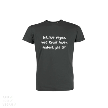T-Shirt Ich lebe vegen… Ich lebe vegan, weil Recht haben einfach geil ist. Shoezuu Textilien werden in unserem Lager vom Shoezuu-Team bedruckt. Unsere Drucke sind phthalatfrei, frei von PVC und BPAs und sie sind OEKO-TEX-Standard 100 zertifiziert. Die unbedruckten Textilien bekommen wir vom belgischen Label Stanley/Stella. Stanley/Stella ist Fair Wear Foundation zertifiziert und hat den Leader Status. Die Bio-Baumwolle ist GOTS zertifiziert und recycelte Materialien sind GRS Global Recycled Standard zertifiziert. Alle Textilien sind OEKO-TEX-Standard 100 zertifiziert. Wir empfehlen Textilien bei 30 Grad zu waschen. Um eine maximale Langlebigkeit der Textilien zu gewährleisten sollte auf bügeln, trocknen im Wäschetrockner, Bleichmittel und Weichspüler verzichtet werden. Selbstverständlich sind Drucke und Textilien vegan.