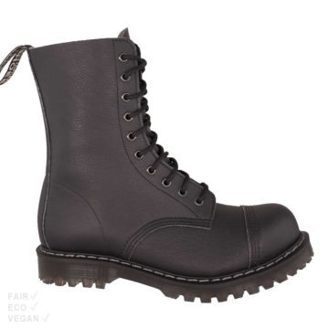 Vegane 10 Loch Ranger Boots mit Stahlkappen Eins der beliebtesten Modelle aus der legendären Vegetarian Shoes Airseal Serie. Aus hochwertigem italienischem Kunstleder in Kombination mit langlebigen Sohlen der britischen Marke Solovair. Die 10 Loch Stiefel mit Stahlkappen werden in einem kleinen traditionellen Werk in Großbritannien gefertigt. Obermaterial: Hochwertiges in Italien hergestelltes Kunstleder. Das dicke „Vegetan Micro“ Material ist strapazierfähig, wasserabweisend und atmungsaktiv. Das Kunstleder ist langlebig, robust und benötigt ein wenig Einlaufzeit. Innenmaterial: Kunstleder Sohlen: Die dicken griffigen Airseal Country Soles von Solovair sind durch die gute Stoßdämpfung und Isolierung sehr komfortabel. Die Sohlen benötigen eine gewisse Einlaufzeit. Schaft/Absatz/Extras: Schafthöhe bei Größe 39 ca. 21,5cm. Absatzhöhe hinten ca. 2,5cm. Die Innensohlen sind herausnehmbar. Schuhpflege: Leicht zu pflegen. Imprägnieren nicht notwendig. Einfach nur reinigen und ggf., zum entfernen von Kratzern und Flecken, ab und zu mit Schuhcreme wie Black Polish Vegan behandeln. Die Schuhcreme schützt auch vor der Anhaftung von Schmutz und vermindert die Bildung von Salzrändern. Fair | Vegan | Ökologisch: Fair: Hergestellt in Großbritannien. Vegan: Alle verwendeten Materialien sind ohne tierische Inhaltsstoffe. Ökologisch: Ohne Leder, daher auch frei von Chrom VI. Die Schuhkartons haben kurze Transportwege innerhalb Europas. Vegane Airseal 10 Eye Boots Goodyear Welted Construction Die Vegetarian Shoes Airseal 10 Eye Ranger Boots sind für eine lange Laufzeit hergestellt. Das italienische Kunstleder ist besonders robust und die dicken Sohlen sind mit dem Obermaterial nicht nur verklebt, sondern zusätzlich auch vernäht. Goodyear Welted Construction nennt sich diese besonders hochwertige Verarbeitung. Hergestellt in Großbritannien Die 10 Loch Boots werden in einer 1881 gegründeten Schuhfabrik hergestellt. Mit viel Herz und Handarbeit werden dort die hochwertigen Einzelteile zu den Vegetarian Shoes Boots. Vegetarian Shoes Vegetarian Shoes ist die wohl älteste Marke für vegane Schuhe. Seit 1990 stellt der Firmengründer Robin Webb vegane Schuhe her. Er startete mit nur einem Modell, einem einfachen Schnürschuh. Heute gibt es eine riesige Auswahl Veggie Shoes. Alle Schuhe werden unter fairen Arbeitsbedingungen in Westeuropa (Portugal, Großbritannien u. Spanien) gefertigt. Die tierleidfreien Sneaker, Schuhe und Boots sind aus atmungsaktiven Mikrofasern, Hanfstoff und anderen veganen Materialien.
