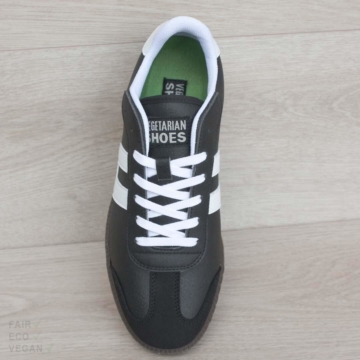 Cheatah Sneaker von Vegetarian Shoes Super bequeme schwarze Schnürschuhe mit sportlichem Design. Ob Konzert, Dancefloor oder Demo, die Allrounder aus robustem Kunstleder sind für das ganze Jahr geeignet. Obermaterial: Mikrofasern Atmungsaktiv Widerstandsfähig Innenmaterial: Stoff Sohlen: Die griffigen Sohlen sind aus Gummi. Schaft/Absatz/Extras: Flache durchgehende Sohlen. Die Innensohlen sind herausnehmbar. Pflege: Leicht zu pflegen. Imprägnieren nicht notwendig. Einfach nur reinigen und ggf., zum entfernen von Kratzern und Flecken, ab und zu mit Schuhcreme wie Black Polish Vegan behandeln. Die Schuhcreme schützt auch vor der Anhaftung von Schmutz und vermindert die Bildung von Salzrändern.. Fair/Vegan/Ökologisch: Fair: Hergestellt in Portugal. Vegan: Alle verwendeten Materialien sind ohne tierische Inhaltsstoffe. Ökologisch: Ohne Leder, daher auch frei von Chrom VI. Die Schuhkartons haben kurze Transportwege innerhalb Europas. Die lederfreien Sneakers gibt es in Damen-, Herren- bzw. Diversgrößen von 36 bis 47.