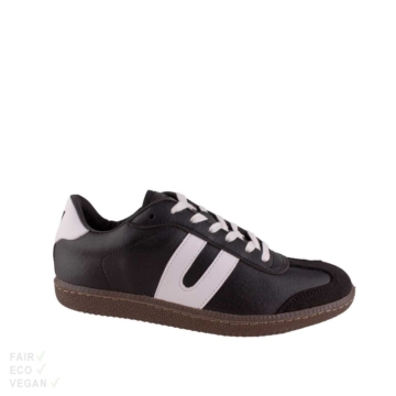 Cheatah Sneaker von Vegetarian Shoes Super bequeme schwarze Schnürschuhe mit sportlichem Design. Ob Konzert, Dancefloor oder Demo, die Allrounder aus robustem Kunstleder sind für das ganze Jahr geeignet. Obermaterial: Mikrofasern Atmungsaktiv Widerstandsfähig Innenmaterial: Stoff Sohlen: Die griffigen Sohlen sind aus Gummi. Schaft/Absatz/Extras: Flache durchgehende Sohlen. Die Innensohlen sind herausnehmbar. Pflege: Leicht zu pflegen. Imprägnieren nicht notwendig. Einfach nur reinigen und ggf., zum entfernen von Kratzern und Flecken, ab und zu mit Schuhcreme wie Black Polish Vegan behandeln. Die Schuhcreme schützt auch vor der Anhaftung von Schmutz und vermindert die Bildung von Salzrändern.. Fair/Vegan/Ökologisch: Fair: Hergestellt in Portugal. Vegan: Alle verwendeten Materialien sind ohne tierische Inhaltsstoffe. Ökologisch: Ohne Leder, daher auch frei von Chrom VI. Die Schuhkartons haben kurze Transportwege innerhalb Europas. Die lederfreien Sneakers gibt es in Damen-, Herren- bzw. Diversgrößen von 36 bis 47.