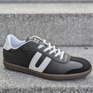 Cheatah Sneaker von Vegetarian Shoes Super bequeme schwarze Schnürschuhe mit sportlichem Design. Ob Konzert, Dancefloor oder Demo, die Allrounder aus robustem Kunstleder sind für das ganze Jahr geeignet. Obermaterial: Mikrofasern Atmungsaktiv Widerstandsfähig Innenmaterial: Stoff Sohlen: Die griffigen Sohlen sind aus Gummi. Schaft/Absatz/Extras: Flache durchgehende Sohlen. Die Innensohlen sind herausnehmbar. Pflege: Leicht zu pflegen. Imprägnieren nicht notwendig. Einfach nur reinigen und ggf., zum entfernen von Kratzern und Flecken, ab und zu mit Schuhcreme wie Black Polish Vegan behandeln. Die Schuhcreme schützt auch vor der Anhaftung von Schmutz und vermindert die Bildung von Salzrändern.. Fair/Vegan/Ökologisch: Fair: Hergestellt in Portugal. Vegan: Alle verwendeten Materialien sind ohne tierische Inhaltsstoffe. Ökologisch: Ohne Leder, daher auch frei von Chrom VI. Die Schuhkartons haben kurze Transportwege innerhalb Europas. Die lederfreien Sneakers gibt es in Damen-, Herren- bzw. Diversgrößen von 36 bis 47.